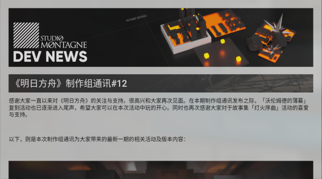 今日下午,鹰角终于是放出了最新一期的制作组通讯#12!从内容来看,有点小遗憾,不仅没有万众期待的新主线剧情,也没有透露新的干员情报,整体内容略显单薄,渗透出一种淡淡的长草味。让我们先来具体分析看看吧!