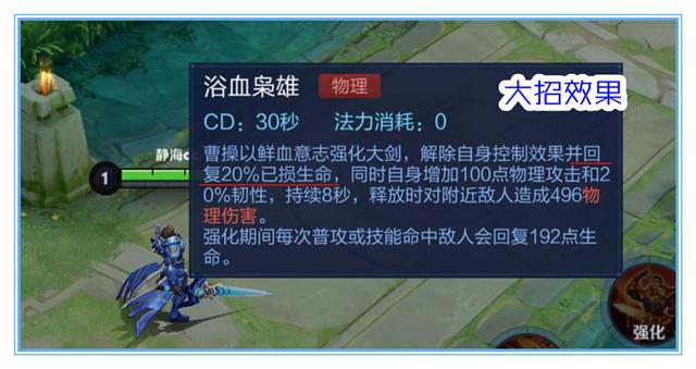 也许策划是认为曹操加强一技能后强度会超标吧,所以他们同步调整了他的大招,将曹操开启大招后能够回复的血量削弱了一半,从原先的20%已损失生命下调到了10%已损失生命,这个调整越到后期越是吃亏。