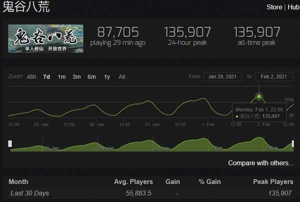 这些年,国产独立游戏在Steam上的表现越来越勇猛,前些年国产游戏最高在线峰值一直在数万左右徘徊,到了年初《戴森球计划》和《鬼谷八荒》推出之后,两者在Steam上的在线峰值屡创新高,特别是沙盒修仙RPG游戏《鬼谷八荒》,其Steam在线人数峰值一度突破13万,这个数据让国内玩家欢欣雀跃。
