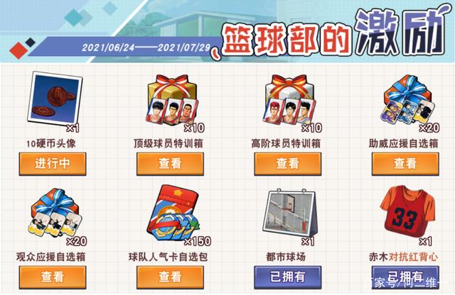 然后本周开启了新一轮的篮球部的激励,比较有意思的资源是硬币头像和都市球场,当然赤木的红背心大家也可以考虑一下,整体来说还是不错的,适合在周年庆期间没有拿到都市球场的朋友来多多参与一下。