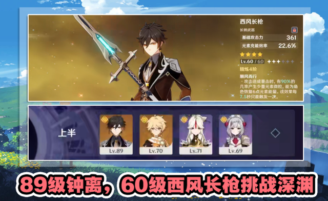 看到这里肯定会有玩家产生疑问,这套阵容看上去很普通,对武器和圣遗物的要求也不高,那么实战效果怎么样呢,真的可以打通深渊吗?让我们来看看下面的测试,这位玩家使用的是89级的钟离和70级的岩主,武器用的是60级的西风长枪,还随便凑了凝光和诺艾尔,她们的等级也很低,分别是71级和69级,挑战的是本期深渊的12-1上半,怪物是岩龙蜥。