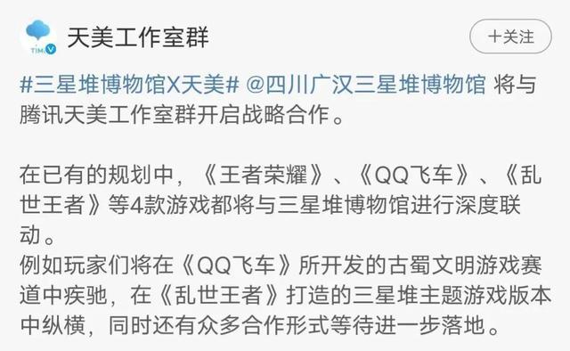 那么我上面也说了,官方再曝光大乔这款皮肤的同时,她也曝光了,会与三星堆博物馆进行联动,那么与三星堆博物馆的联动,还并非只是王者荣耀这一款游戏,可以说是腾讯旗下四款游戏同时联动。