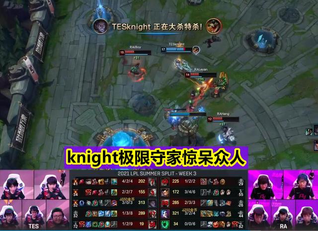 不过由于没有了两座门牙塔的原因,RA这边也是明知正面打不过,所以就一直想要偷家,而TES这边也是只有knight一人是找到了RA这边5人的位置,但奈何没能够打断瑞兹的大招,最后TES又一次的被偷家翻了盘。