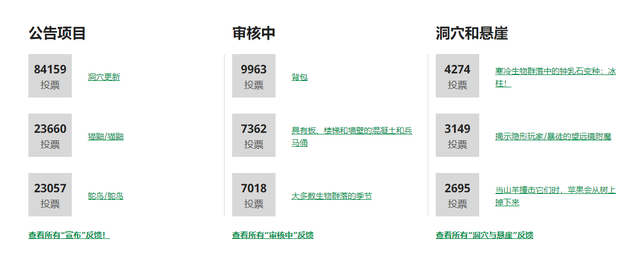 打开官方的反馈界面,你会看到三个栏目,一个是已经确认宣布的内容,一个是还在审核中的内容,还有一个就是关于洞穴与山崖的反馈,这其中的意见都是来自于玩家,玩家在游戏中发现的,亦或者是自己凭空想象的,都可以在这里进行反馈,这些反馈建议都会被官方看到。如果官方觉得合理,那么就会被确定宣布,也就是未来的某一天会加入到游戏中。接下来让我们一起去看看排在前五的已经宣布的更新内容。