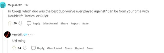 可以看出,冠军并不是用来评价一名选手实力的唯一标准,只要在职业赛场上打出足够精彩的表现即便是对手也会向其表示尊敬,就比如CoreJJ的这次问答,冠军双人组有不少,但他却偏偏把最强双人组的名号送给了Uzi和Ming!