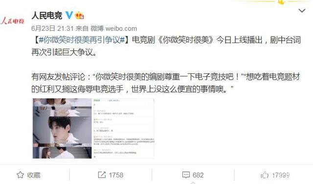 而近日,又有一部以电子竞技为题材的电视剧开播了,那就是《你微笑时很美》,但这部剧在刚开播后就遭到了网友们的吐槽,不仅涉嫌抄袭融梗,而且里面的很多情节还非常离谱,其中有台词更是涉嫌宣传假赛,这一时也引起了网友们的热议,最终人民电竞更是直接点名了这部剧。
