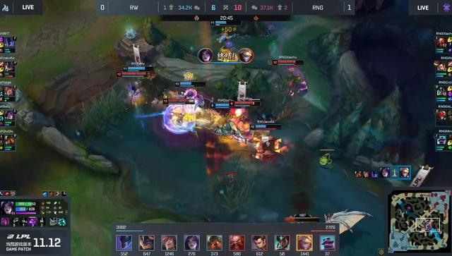 比赛前期:双方正常开局,RNG三分钟四包二下路,完美配合越塔击杀RW双人组,随后RW众人入侵RNG蓝buff野区,但配合过于粗糙,又被RNG击杀两人;8分钟,峡谷先锋争夺战,RNG抢下峡谷先锋但并未捡到先锋之眼,还被RW打出一换三,转头RNG利用下路对线优势拿下第一条小龙火龙,并在上路越塔击杀梦魇,此时双方经济基本持平!