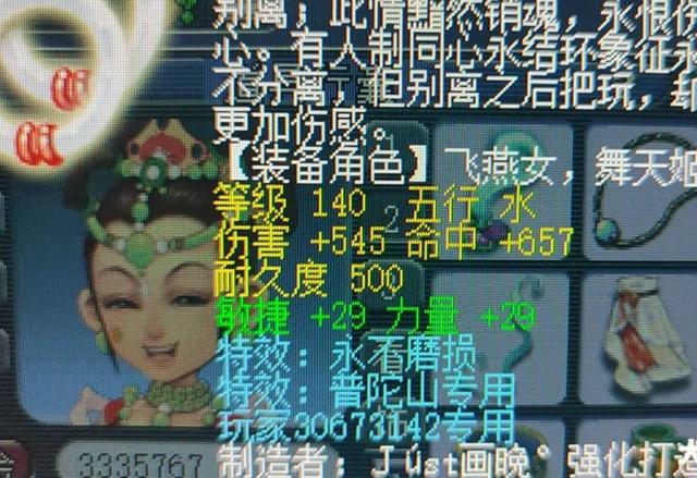 上面是140级专用的武器,这把武器的伤害属性虽然没有达到物理系梦想级别,但是也不低了,因为他的伤害达到了545,命中达到659,而且还增加了29点敏捷和29点耐力,另外还附带了永不磨损特效,虽然门派是普陀山,但是为了这把武器值得转门派的,就是小编看着上面这位玩家的角色等级应该是109级左右的,需要升到159级,这里面需要付出的升值成本是比较高的。