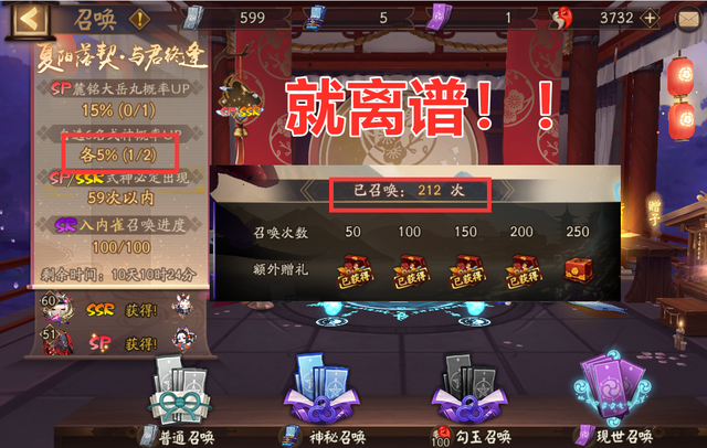 小然我在抽完自己账号的200抽之后,其实就已经感觉有些不对劲,于是立刻去社交平台上看了看其他玩家的战况。于是乎,看到大部分玩家都在吐槽,称其为“高端骗票活动”。毕竟它不如SSR/SP新式神出现时那样,会让痒痒鼠们的黑屏概率提升,相反活动想抽出SSR/SP式神完全靠60次的保底,UP的关键点在与保底之后出现的式神种类。