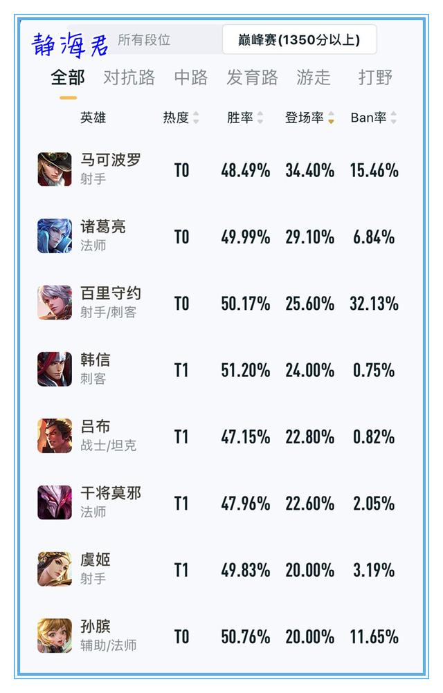 我很少发长图,这一次实在忍不住了。大家看一看在巅峰1350分以上的对局中,出场率排名前8的英雄,大家凭良心说说,典韦可以稳吃哪一个?
