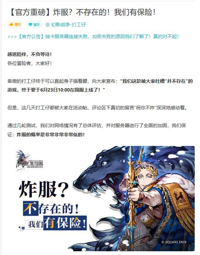 上线之前,官方在TapTap论坛上表示:他们买了一个“炸服保险”。如果公测首日出现全服大规模无法登录或频繁掉线的情况,将为全体玩家送上“保险报销”:钻石和十连召唤券,且补偿力度会随炸服时间增加而加大。