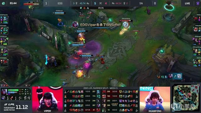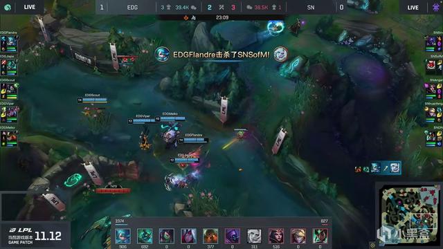 31:30,EDG带着大龙buff向前推进,EZ吃了卡尔玛一个E技能迷失了自我,直接E到了日女脸上进行输出,日女肯定不惯着,闪现E指到EZ,配合队友直接击杀了EZ,在击杀了EZ后,SN急于追击但落入了EDG的圈套,塞拉斯带着纳尔大已经等候多时,近距离追击的日女兰博纳尔三人组直接被击杀,后续狗熊追上了没有位移的维鲁斯,击杀维鲁斯后EDG一波结束了比赛。