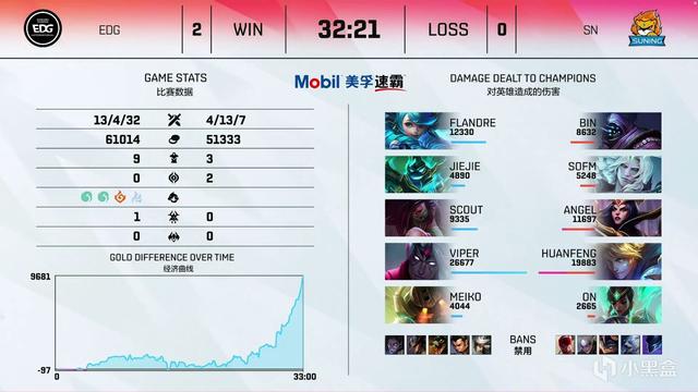 32:11,有着水龙魂和大龙buff的EDG毫无悬念的结束了比赛。