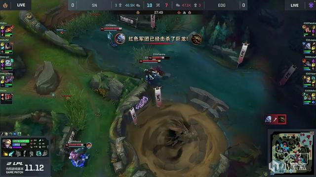 22:42,EDG先一步打小龙并且成功拿到听牌龙,后续塞拉斯二段E拉到日女,EZ跟上伤害收下日女人头。