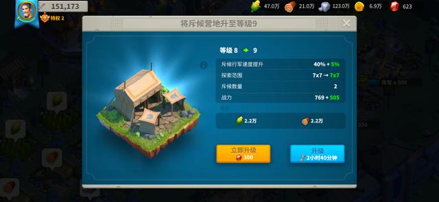 这是玩家们最容易忽视的一个建筑,在游戏前期资源匮乏,而资源的来源有限,想要短时间获得大量资源要么氪金,要么就是探索地图。升级斥候营地能够增加斥候探索范围,增加斥候移动速度以及斥候数量。帮我我们更快探索地图,找到资源。