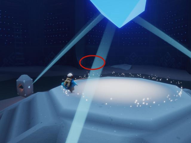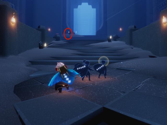 一楼四人门内部有一个大蜡烛。很多人喜欢用矮人面具,在指定地方,连续垂直飞,挤到建筑模型里面拿。 这种方法比较慢,还容易被卡住。 最流畅的方法,是进门后,直奔小红圈所标记的先祖这里。