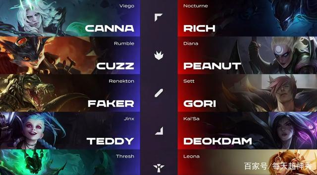 无路可退,T1队长锁下鳄鱼迎战曾经的替补Gori瑟提,Cuzz抢到兰博搭配Canna佛耶戈,NS小花生和Rich用皎月+梦魇应对,状态低迷的机长Teddy使用金克斯与锤石走下,等待他们的是卡莎+曙光女神经典组合。