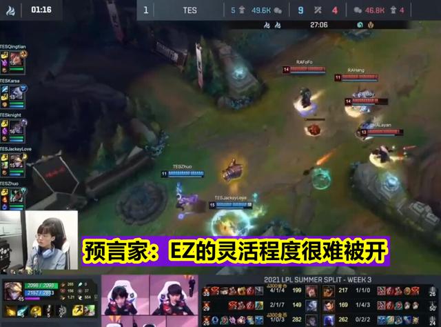 因为不需要上场,所以这次预言家也是全程直播了TES的比赛,不过这次比赛中还是出现了非常戏剧化的一幕。第三局的比赛中,当RA众人开启技能冲脸JackeyLove,结果被JackeyLove跑掉的时候,JackeyLove直接亮了个图标,而此时的预言家也说道:“EZ的灵活程度很难被开的。”