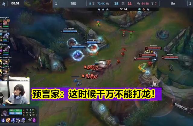 但除此之外,预言家还有一波解说,也是引起了不少观众的议论,因为在最后一波的时候,TES是有大龙逼团的意思,而这时候的预言家也是直言道:“这时候,千万不能打龙,瑞兹直接开车偷家了!”然而刚说完,RA这边果然是瑞兹开大偷家,纵然被knight发现,却也无力回天,但这一波也足以体现,现在的TES,很多时候的策略真的做得非常糟糕。