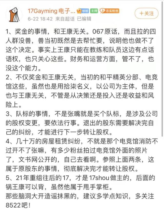 其实就整件事情来说,就像067说的那样,虽然17shou也是股东之一,但是他却没有决策权,事后也还帮他们跟之前的老板沟通过,所以整件事情算是跟17shou无关,但是在事件发酵之后,17战队官方粉丝群里面的一则公告则是让不少吃瓜群众有点傻眼了,跟之前著名的“四问官方”一样,在解释了事件的来龙去脉之后,这个“官方号”居然在公告的最后一句写着:8522!