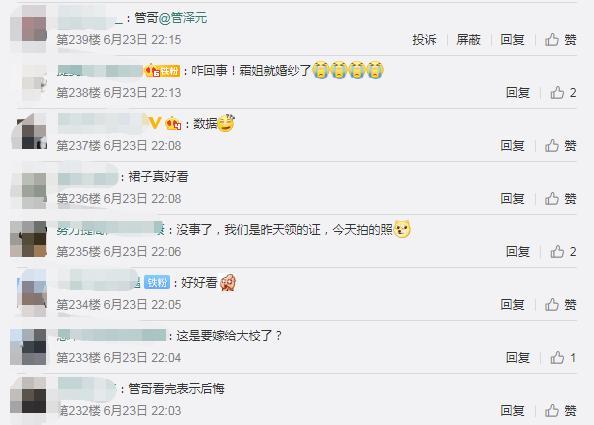 也因此许多人都怀念起了当初管泽元与余霜之间的爱情。倘若两人不分手的话,那么如此明艳动人的余霜未来将可就是管泽元的新娘了。