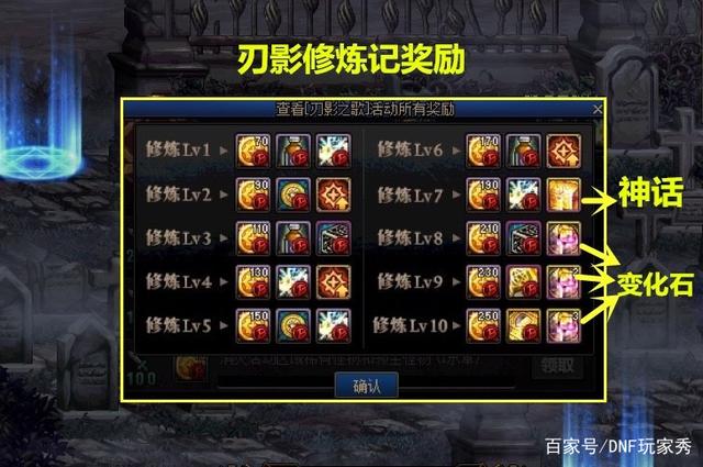 新角色和偷跑角色都可以参与,一共10个修炼等级,核心奖励为“1个随机神话罐”、“6个神话变化石”,还有其它的一些细节打造奖励,比如“红字书、史诗自选罐子”等。