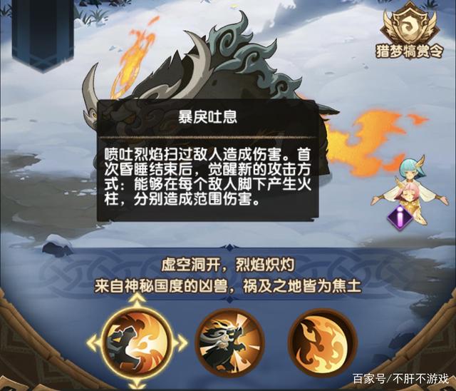 暴戾吐息:喷涂烈焰扫过敌人造成伤害。首次昏睡结束后,觉醒新的攻击方式:能够在每个敌人脚下产生火柱,分别造成范围伤害。伤害非常之高的一个技能,要打满90秒时间的话,队伍中必须得有续航单位。