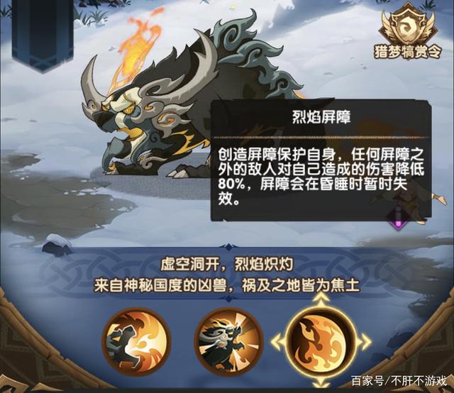 烈焰屏障:创造屏障保护自身,任何屏障之外的敌人对自己造成的伤害降低80%,屏幕会在昏睡时暂时失效。曾经有一种打法师在年兽屏障破了之后,同一放大进行集火攻击,但现在普通玩家点自动即可,多少伤害并不会影响太多排名。