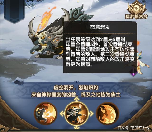 怒意激发:当狂暴等级达到2层与5层时,年兽会昏睡5秒。首次混熟结束后,年兽觉醒真滴攻击可以伤害到背后的敌人。第二次混熟结束后年兽对面前敌人的攻击将变得更为猛烈。狂暴2层累积伤害是1亿,5层累积伤害是3亿,基本上用不了30秒就能打完这两层的狂暴,之后的年兽打人会更疼。