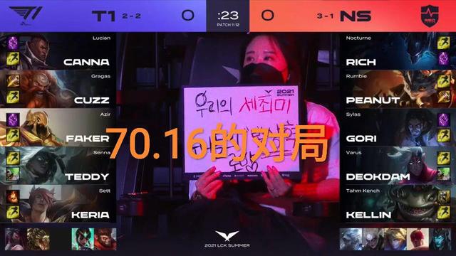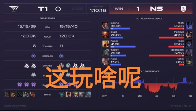 整场比赛一共进行了70分钟,人头比为15:15,总共的人头数还不到时间的一半。阵容的选择上,t1拿到了一个大后期的纯输出阵容,上单卢锡安,打野酒桶,中单沙皇,AD塞纳,辅助劲夫。这套阵容要开团,有开团要输出,有输出进入到后期之后,几乎是一个铁桶阵。Ns战队的选择就偏前期一点,拿到了上单梦魇,打野兰博,中单塞拉斯,AD韦鲁斯,辅助塔姆。主要打的就是大招的一套爆发。