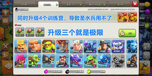这位小伙伴只能等到“训练营”升级完成以后,才能训练圣水兵种,所以正在解锁“龙骑士”的小伙伴最多只能升级三个训练营,才不会影响我们正常的游戏,否则就会像这位小伙伴一样,导致圣水兵种不能训练的结果。