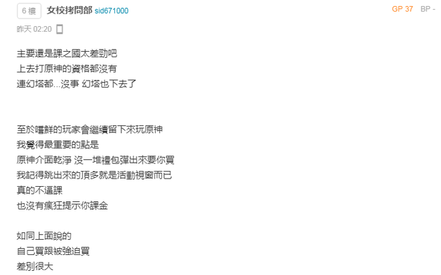女校:主要还是氪之国太差劲了,上去打原神的资格都没有,连幻塔都……没事,幻塔也下去了。我觉得最重要的点是原神的界面很干净,没有一堆礼包弹出来让你买。