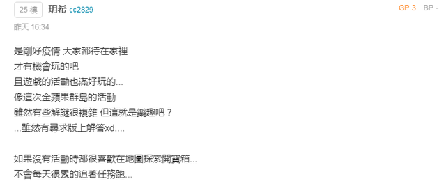 玥希:刚好赶上疫情,大家都待在家里面,才有机会玩吧。而且游戏的活动也很好玩,像这次的金苹果群岛活动,虽然有些解密很复杂,但是这就是乐趣吧?如果没有活动的时候很喜欢在地图探索开宝箱,不会每天都很累的追着任务跑。