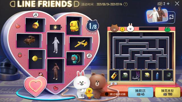 A奖池的内容,为《Pubg Mobile》和“Line Friends”进行的新联动,该转盘的主要道具包含:可妮兔套装、莉莎背包、布朗熊套装、恐龙布朗熊背包,和布朗熊吉普车新皮肤,以及Line Friends飞艇载具涂装。