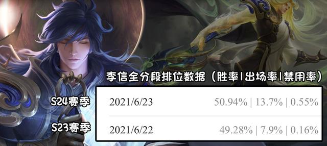 而李信这个热度较高的英雄,在新赛季他的胜率和出场率同样得到了质的飞跃。李信的基础血量提升,四级发育的速度更快,更重要的是对于反甲有一定的削弱之后。李信玩家算是如释重负,不过他的胜率虽然提高了,不过根据数据表明觉大部分的胜率场次是由暗信创造出来的,这就意味着其实真的想靠李信获胜,更多还需要将目标放在按暗信上,至于光形态只能当做是玩家的信仰。