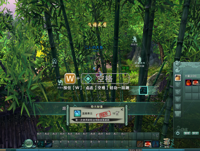 新手村的角色,都可以使用轻功,和其他版本的剑网3一样,两下前进+空格起飞,再空格拔高,再空格滑行,再空格加速,再空格降落。这种传统的轻功,可以让玩家很快地上手。但是要注意一点,会卡在障碍物上。比如新手村的竹林,小编就卡住了。这种状态下,只要轻微移动,就会从高空掉落,相当细腻的游戏设定。