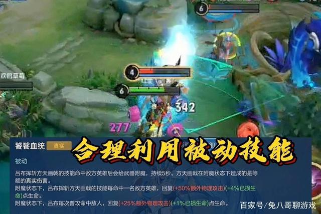 吕布的被动技能所造成的真实伤害,是可以无视任何的防御属性的,也就是说该英雄即使在没有任何装备加持的情况下,都可以通过触发真实伤害来对敌方前排英雄进行破防。而且该被动技能在触发之后,每一次的方天画斩都能够造成回血,以及每一次的普通攻击也可以回血,而这个回复两是以额外物理攻击为基础的。也就是说无论攻击越高所获得的回复量就越大,这样就保证了吕布所需要的续航。