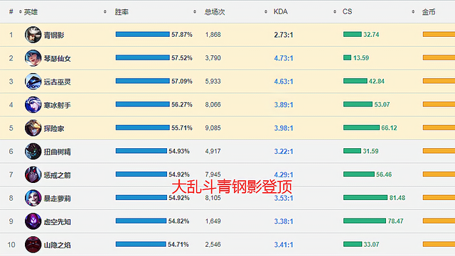 与刺客英雄相比,青钢影在大乱斗里凭借着输出伤害+10%, 承受伤害-10%, 护盾效果+10%在最近几个版本的排名直线上升,并于11.3版本上线后成功登顶。青钢影在当前版本里承伤减少降了一些,变为95%,但因为死亡之舞被动的加强,即治疗效果由10%最大生命值提升到15%,整体反而更强了。出完神圣分离者,血手以及死亡之舞的青钢影单挑几乎无人能敌,即使是在团战里想要秒掉一个青钢影难度也不小。而且青钢影的机动性实在优秀,其输出能力也很可怕,脆皮一旦被青钢影Q技能的第二脚踢到很容易暴毙。