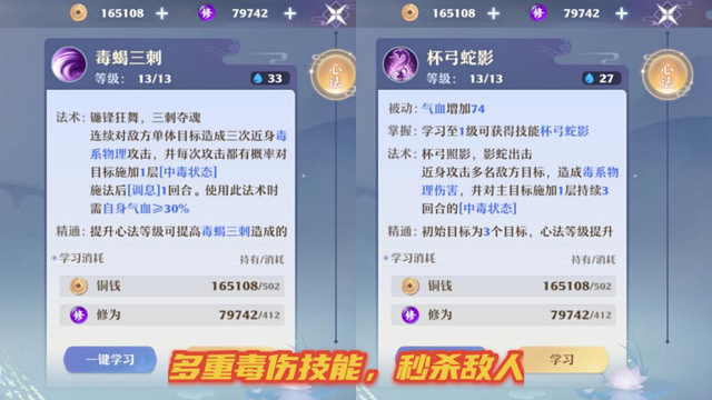 用毒是万毒门的主要核心,目前配备有七钟技能,分别是飞蚁庇护、毒步天下、钩镰斩、七尾蜈蚣、矿蝎连击、毒虫之镰以及影蛇出击。如果你是喜欢稳定输出的玩家这门职业是必选的。