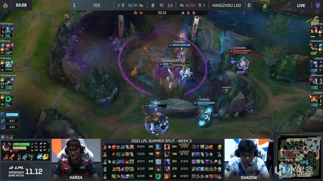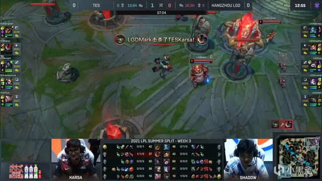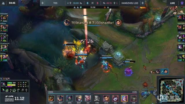 第一局比赛,前期Shadow赵信入侵扰乱Karsa节奏,中期小龙团战,Karsa用兰博大招多次留人,分割敌方阵型,下路jkl本局也比较稳定,鳄鱼扛住了中期团战的任务,后期,双C装备成型输出拉满,LGD一波推塔的决策失误,没能及时撤退,TES一波结束比赛,以1-0 暂时领先LGD!