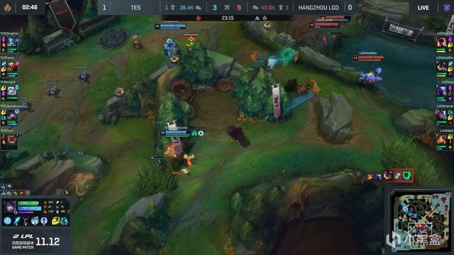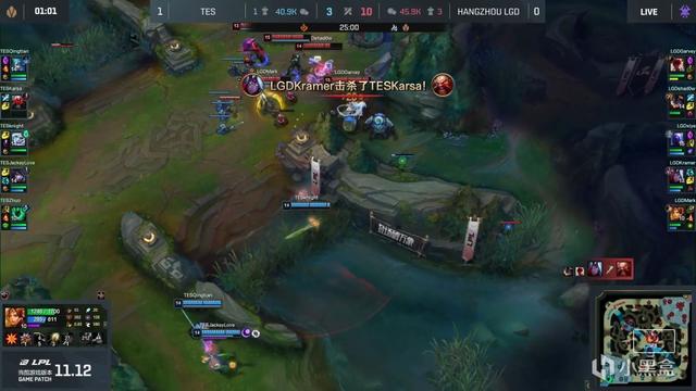 40:03,TES打大龙,LGD两人直接推下路,还好TES拿下大龙,击杀LGD野辅,qingtian格温再TP,嘉伟盲僧一脚踢回厄斐琉斯,打掉jkl复活甲!