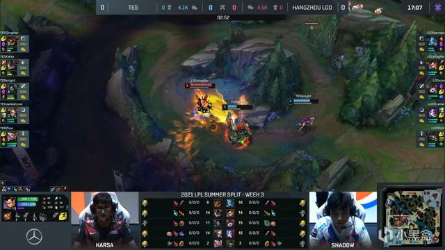 17:20,中路Karsa放出先锋,Shadow赵信进场,Karsa兰博扫大,LGD中单Xiye和辅助双闪撤退,好在先锋被LGD惩掉,没有撞出来!