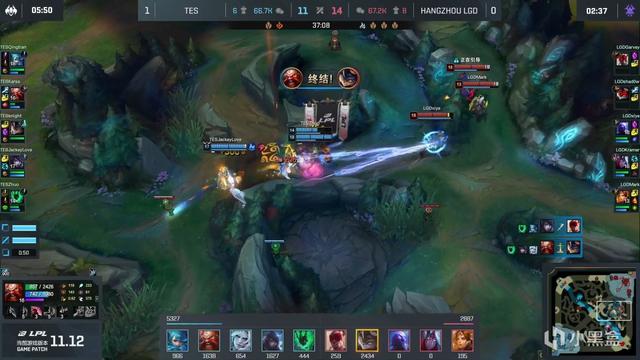 37:50,LGD守住基地,xiye瑞兹TP,推掉一颗门牙塔,和辅助一换一,正面TES其余三人继续击杀Mark日女,也是打得非常刺激!双方再拉开!