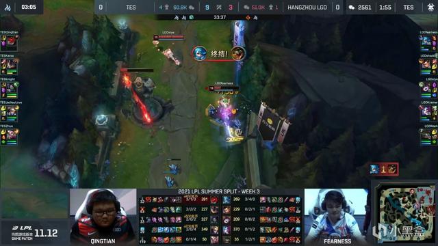 3:30,前期优势Shadow的兰博率先发动,配合嘉伟击杀qingtian的格温!这位新到LPL的小将状态也是十分出色!