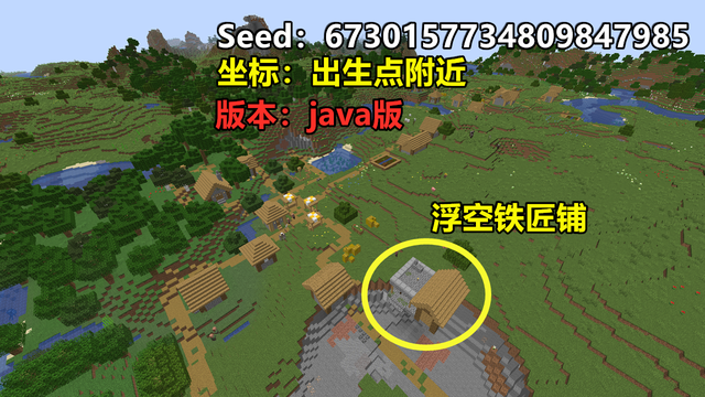 这个种子属于开局村庄类型,而且如果你看得仔细,会发现其实是开局两个村庄,离出生点只有一点点距离的位置。但比较奇特的还是这个有铁匠铺的村庄,一是铁匠铺本身就更有吸引力,二是这个铁匠铺几乎是完全浮空的,在其下方是一个天然形成的大坑。不过看似完全浮空,其实还是有一个小角是搭在了地面上的,这总算是能解释得通了,不然牛顿老先生必然会揭棺而起。