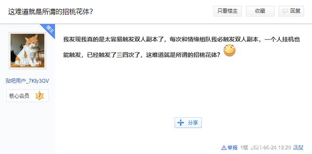 不得不说官方为了帮助少侠在游戏中追爱煞费苦心,不但制作双人道具、动作、小游戏等等帮助双方互相提升好感,在前不久还精心打造了双人奇遇副本。单就“两人身处一片幽暗森林中,视野只能看到身边的狭窄范围”这一设定......其中心思不言而喻。不过这可给还未找到心仪对象的少侠们造成了“巨大打击”,正所谓旱的旱死,涝的涝死。一玩家在贴吧开贴凡尔赛,吐槽自己太容易触发双人副本,每次和情缘组队必触发双人副本!
