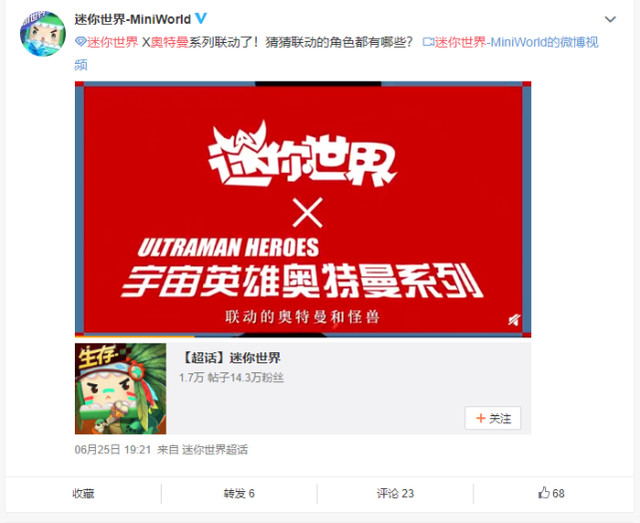 可就是这样风评极差的山寨盗版游戏,居然直接公布了和奥特曼系列英雄联动的消息,并且在官宣之后还有不少迷你世界玩家表示支持。当然了,目前新创华和奥特曼中国官方微博还没有发布联动消息,有人也说这可能是奇奥天尊的复活,毕竟最近奥特曼的热度很大,从汽车品牌公司到线下活动都想蹭一口。