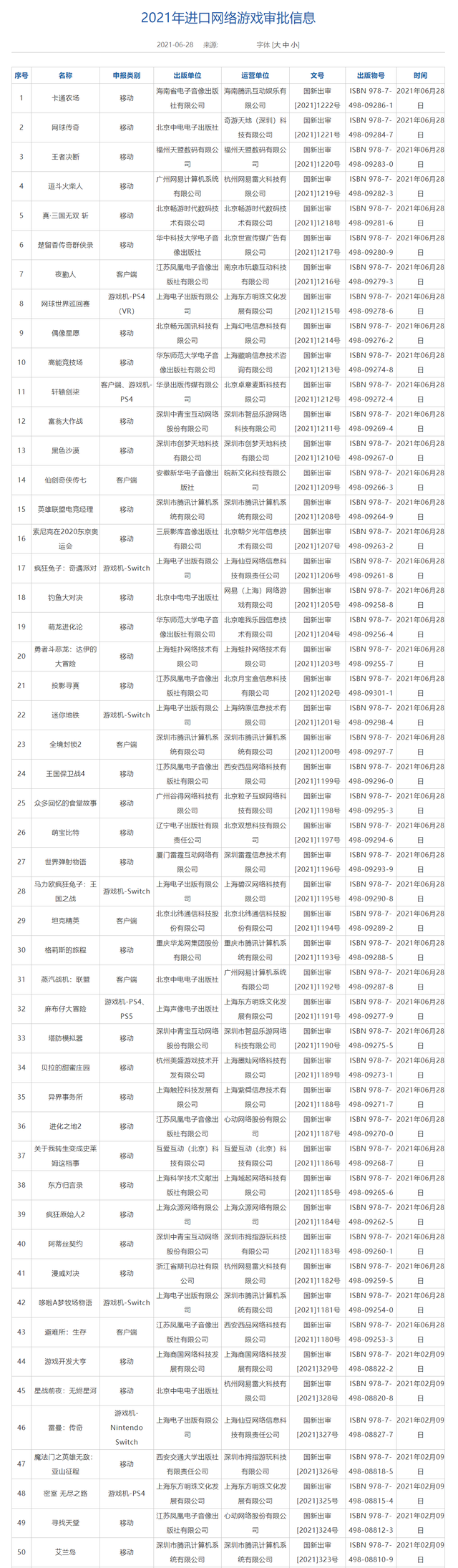 IT之家 6 月 28 日消息 今晚国家新闻出版署发布了 2021 年 6 月进口网游审批信息,共有 76 款游戏获得了版号。在这之中,包含移动端、PC 端以及游戏机的游戏,游戏运营商包括腾讯、网易等。