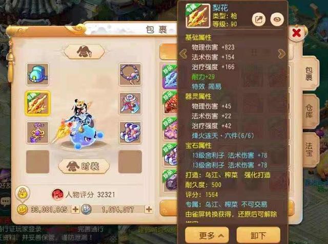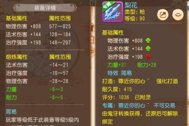 同样都是90级简易梨花,但这把肯定要更加优秀。物理伤害808,力量+31、耐力+28。有一说一,如果把装备等级给遮住,大树肯定认为这就是一把神威的武器!试想一下,当一位89月宫玩家带着这种级别的武器上场战斗,那会是一种什么效果呢?应该能成为全场最亮眼的崽吧!上面两把都偏向于物理,接下来就让我们把目光转向法系,看看都有什么样的“神器”。