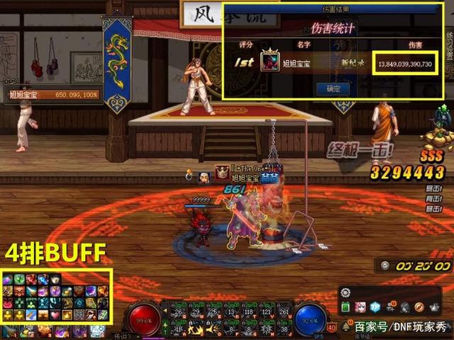 【2】其次是红眼角色,旭旭宝宝氪金1亿打造顶级大号,常规打桩10.2万亿,在4排“不要脸”的Buff加持下,各种药剂、蛋糕、白兔子齐出,最终20秒伤害定格在13.8万亿,和改造比稍显不足,但是也足以傲立国服伤害榜前3,这张截图,也将成为伤害改版后,旭旭宝宝红眼的最高纪录。